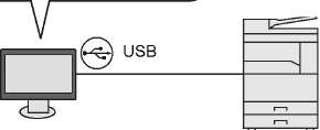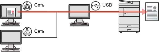 Если компьютер, подключенный к аппарату (хост-компьютер) через USB, также соединен с другим компьютером (клиентский компьютер) по сети, то возможна печать со второго компьютера по сети, для чего нужно настроить аппарат как общий принтер.