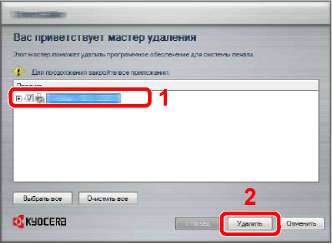 Чтобы открыть мастер удаления, в Windows нажмите кнопку [Пуск] и выберите [Все программы], [Kyocera] и [Удалить Kyocera Product Library].
