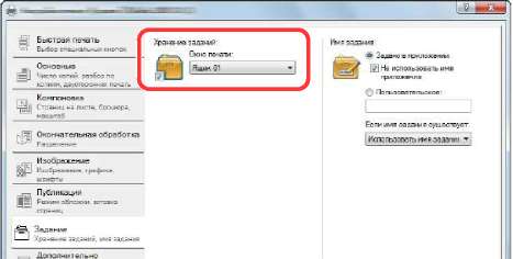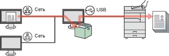 При настройке параметра [Ящик печати] на вкладке [Задание] драйвера принтера и последующей печати задание печати сохраняется в ящике на ПК, а саму печать при этом можно выполнить с аппарата. Настроить ящик печати можно в KYOCERA Client Tool.