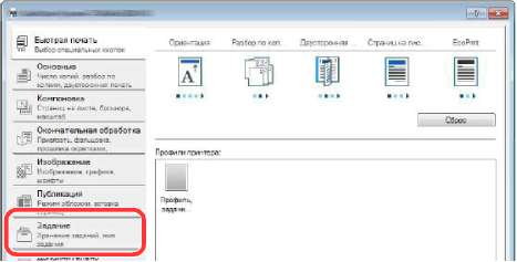Параметры драйвера принтера можно сохранить в качестве профиля. Сохраненные профили можно вызвать в любой момент, таким образом они представляют собой удобный способ сохранения часто используемых настроек.