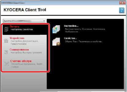 Данный список, расположенный в верхней части экрана Kyocera Client Tool, содержит все поддерживаемые аппараты, установленные на компьютере. Можно выбрать из списка аппарат и просмотреть его свойства и выбрать доступные возможности, например, настройку, обслуживание и загрузку драйверов.