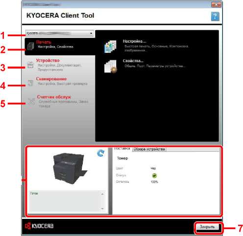 Ниже приведен обзор экрана Kyocera Client Tool.