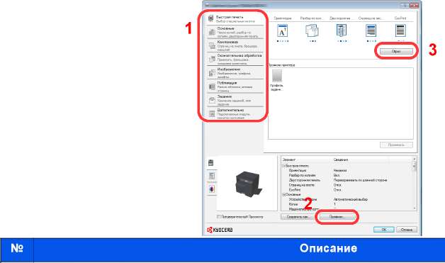 При настройке параметра [Ящик печати] на вкладке [Задание] драйвера принтера и последующей печати задание печати сохраняется в ящике на ПК, а саму печать при этом можно выполнить с аппарата. Настроить ящик печати можно в Kyocera Client Tool.