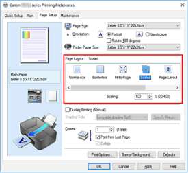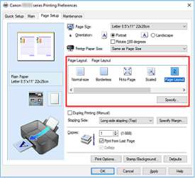 Выберите пункт Норм, размер (Normal-size), По размеру бумаги (Fit-to-Page), Масштабирование (Scaled) или На развороте (Page Layout) из списка Макет страницы (Page Layout).