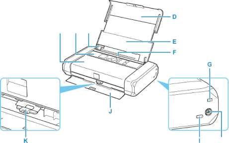 J: Крышка отверстия для выхода бумаги