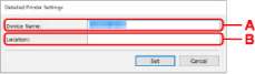Имена отображаются в разделах Имя устройства: и Расположение: на экране Canon IJ Network Device Setup Utility.