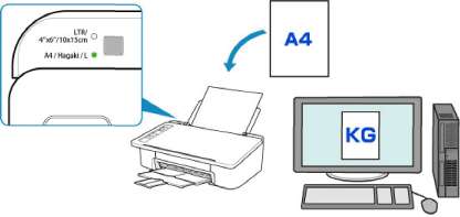 Например, если для размера бумаги для печати используется настройка KG, а размер бумаги, зарегистрированной в принтере, имеет значение A4, перед печатью необходимо загрузить бумагу KG.