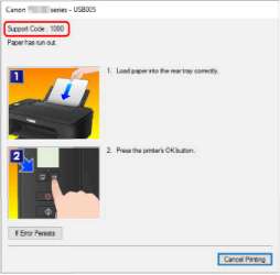 Если происходит ошибка печати (например, в принтере заканчивается бумага или происходит замятие бумаги), автоматически выводится сообщение с рекомендациями по устранению неполадок. Выполните соответствующие действия, указанные в сообщении.
