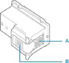 Не прикасайтесь к электрическим контактам (А) и соплам печатающей головки (В). При прикосновении к ним принтер может выполнять печать неправильно.
