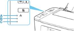 А: Индикатор Аварийный сигнал (Alarm) В: Индикатор Черные чернила (Black Ink) С: Индикатор Цветные чернила (Color Ink)
