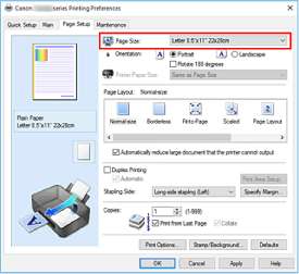 Проверьте список Размер стр. (Page Size). Чтобы изменить настройку, выберите в списке другой размер страницы. В списке отображаются только те размеры, которые можно использовать для печати без полей.