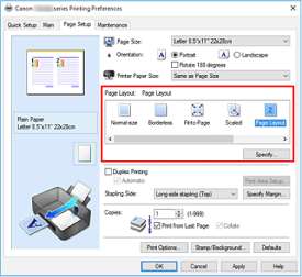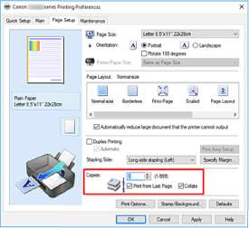 • Если для параметра Макет страницы (Page Layout) выбрано значение Плитка/постер (Tiling/ Poster), параметр Печать с последней страницы (Print from Last Page) отображается серым цветом и недоступен.