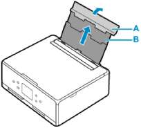 1. Откройте крышку заднего лотка (A). Вытяните прямо вверх и сложите назад упор для бумаги (B).