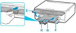 8. Откройте панель управления (E), выдвиньте лоток приема бумаги (F) и упор для выходящей бумаги (G), а затем откройте дополнительный лоток приема бумаги (H).