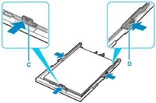 5. Выровняйте переднюю (C) и правую (D) направляющие бумаги по длине и ширине бумаги.