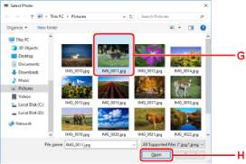 11. Нажмите фотографии (G), которые нужно распечатать, и выберите Открыть (Open)