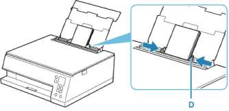5. Сдвиньте правую направляющую бумаги (D), чтобы выровнять направляющие по обеим сторонам стопки бумаги.