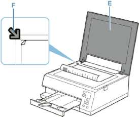 8. Положите оригинал СТОРОНОЙ ДЛЯ КОПИРОВАНИЯ ВНИЗ и совместите его с меткой выравнивания (F).