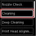 Очистите печатающую головку, если в напечатанном шаблоне для проверки сопел отсутствуют линии или присутствуют горизонтальные белые полосы. Очистка удалит засорение сопел и восстановит состояние печатающей головки. Очистка печатающей головки связана с повышенным потреблением чернил, поэтому выполнять очистку печатающей головки следует только при необходимости.