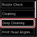 Если качество печати не улучшилось после стандартной очистки печатающей головки, выполните глубокую очистку печатающей головки. Во время глубокой очистки печатающей головки потребляется больше чернил, чем при стандартной очистке печатающей головки, поэтому выполняйте глубокую очистку печатающей головки только при необходимости.