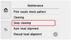 Если качество печати не улучшилось после стандартной очистки печатающей головки, выполните глубокую очистку печатающей головки. Во время глубокой очистки печатающей головки потребляется больше чернил, чем при стандартной очистке печатающей головки, поэтому выполняйте глубокую очистку печатающей головки только при необходимости.