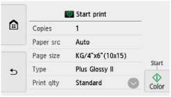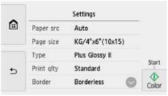 D: Выберите, чтобы отобразить экран Парам. (Settings) Можно изменить параметры размера страницы, типа носителя, качества печати и т. д.