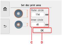 Выберите Внешн. окр. (Outer circle) или Внутр. окр. (Inner circle) (C), укажите область печати, а затем выберите OK (D).