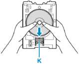 1. Поместите предназначенный для печати диск СТОРОНОЙ ДЛЯ ПЕЧАТИ ВВЕРХ и прижмите его к фиксатору (K) внизу.