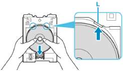2. Продолжая прижимать предназначенный для печати диск к фиксатору, вставьте верхнюю часть диска в прорези (L).