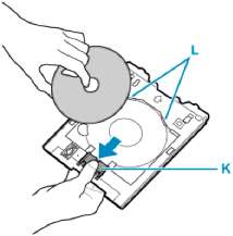 19. Нажимая на фиксатор (K), извлеките диск, допускающий печать, из щели (L) в многофункциональном лотке.
