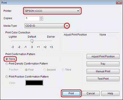 Выберите None (Нет) для параметра Print Confirmation Pattern (Напечатать шаблон подтверждения положения печати) и щелкните Print (Печать).
