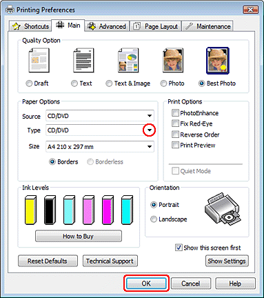 Выберите CD/DVD или CD/DVD Premium Surface (CD/DVD улучшенная поверхность) для параметра Media Type (Тип носителя).