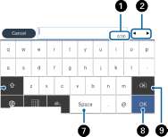 Служит для переключения между типами символов. Можно вводить буквы и цифры, символы или специальные знаки, такие как умлауты и ударения.