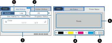 Отображение меню Job/Status. Можно проверить статус принтера и историю заданий. Слева расположен индикатор ошибки, который загорается или начинает мигать, если происходит ошибка.