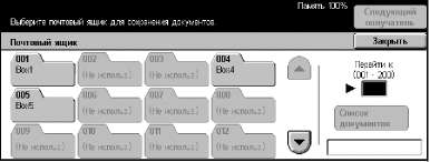 Документы, сохраняемые в персональном почтовом ящике, отображаемом на экране [Проверить почтовый ящик], можно проверять, распечатывать и удалять. Для доступа к некоторым операциям с почтовыми ящиками может потребоваться ввести пароль. Персональные почтовые ящики, созданные другими пользователями, неактивны и недоступны для вас.