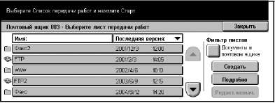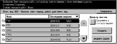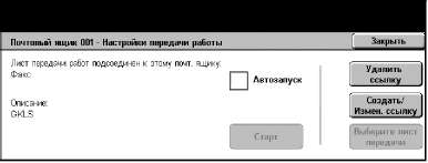 Лист передачи работ, который вы создаете с этого экрана, можно выполнять, изменять, копировать или удалять только из персонального почтового ящика, в котором он был создан. Этот лист не отображается на экране [Листы передачи работ] меню [Меню настройки] на экране [Все режимы].
