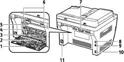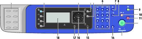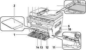 11. Кнопка Стоп: для отмены текущей работы. 12. Кнопка Старт: для запуска выполнения работы копирования, сканирования или факса. 13. Индикатор Состояние: зеленый или красный индикатор указывает состояние принтера: