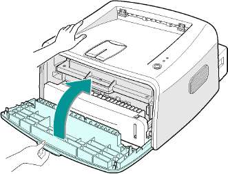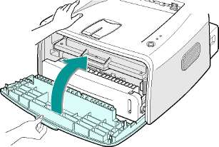 2 Откройте верхнюю крышку и выньте картридж. Протолкните его вниз и выньте его из принтера.