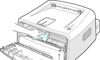 Во время печати внутри принтера скапливаются фрагменты бумаги, частицы тонера и пыль. Эти скопления могут вызвать ухудшение качества печати (например, появление пятен или подтеков тонера). Своевременная чистка внутри принтера позволяет устранить или сократить эти дефекты.