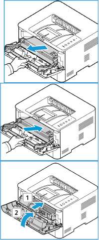 Закройте переднюю крышку. Снова загорится зеленый индикатор состояния аппарата, что означает, что принтер готов к печати. Индикатор уровня тонера должен погаснуть, что означает, что в картридже достаточно тонера для печати.