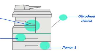 Схема состояния указывает выбранный лоток для бумаги, пустой лоток для бумаги и возникновение ошибки в лотке.