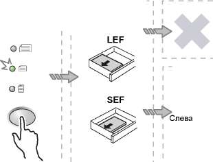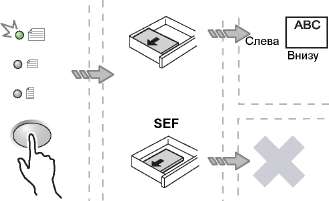 • Если оригинал в податчик загружен правильно, на схеме аппарата (мнемосхеме) загорается индикатор. Если индикатор не загорается, значит оригинал загружен в податчик неправильно.