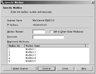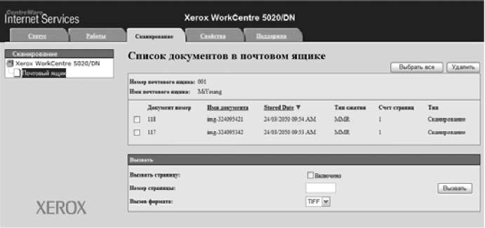 Позволяет сканировать документы и сохранять их в почтовых ящиках. Файлы, полученные в результате сканирования документов, можно импортировать в компьютер с помощью CentreWare Internet Services или утилиты Network Scanner Utility 3.
