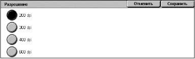 • Разрешение: Стандарт (200 x100 dpi), Высокое (200 dpi), Сверхвыс. (400 dpi), Сверхвыс. (600 dpi).