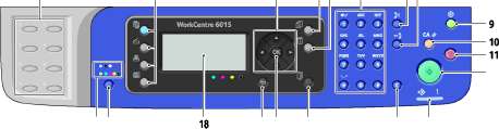 19. Кнопка Цветовой режим: для переключения между цветным и черно-белым режимами при выполнении работ копирования, факса и сканирования.