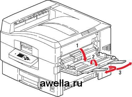 1. Откройте лоток 1 (МЦЛ), потянув за рукоятку, и выдвините удлинители лотка.