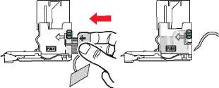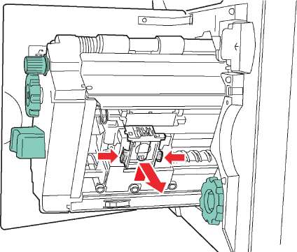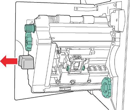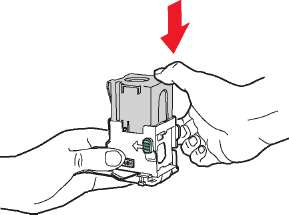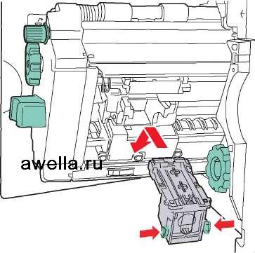 9. Нажмите на зеленые выступы, расположенные с обеих сторон блока степлирования, и вставьте блок в степлер.