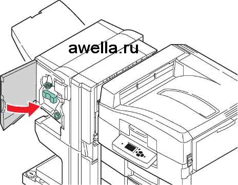 1. Откройте дверцу J с передней стороны сшивателя.