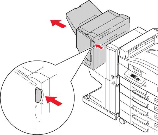 1. Нажмите кнопку, расположенную в верхней части сшивателя рядом с дверцей J, и снимите сшиватель с основания.