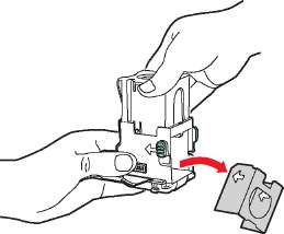 7. Вставьте новый картридж в блок степлирования и потяните за ярлычок, чтобы раскрыть упаковку.